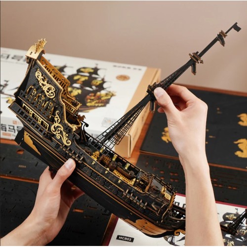 Ontdek het mysterie en de grandeur van The Seahorse Barque, een 603-delige doe-het-zelfpuzzelklassieker van ROKR. Versierd in zwart en goud, is er zowel mysterie als kracht in de ebbenhouten zeilen, het gotische achterstevenkasteel en het gouden zeepaardje als boegbeeld. Dit is geen doorsnee galjoen; de rij glinsterende kanonnen verheft de status als een 16e tot 18e-eeuws oorlogsschip dat koninklijke monarchen diende. Ga deze uitdagende bouw aan en bewapen jezelf met geduld en vaardigheid, want je wordt beloond met een meesterwerk van 470 mm x 180 mm x 390 mm waarmee je kunt spelen en dat je met trots kunt tentoonstellen. Het heeft een draaibaar roer, 8 vierkante en 5 voor- en achterzeilen, ingewikkelde dekgravures en betoverende nautische elegantie die een blijvende indruk achterlaat