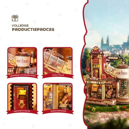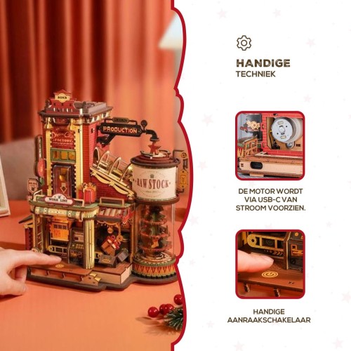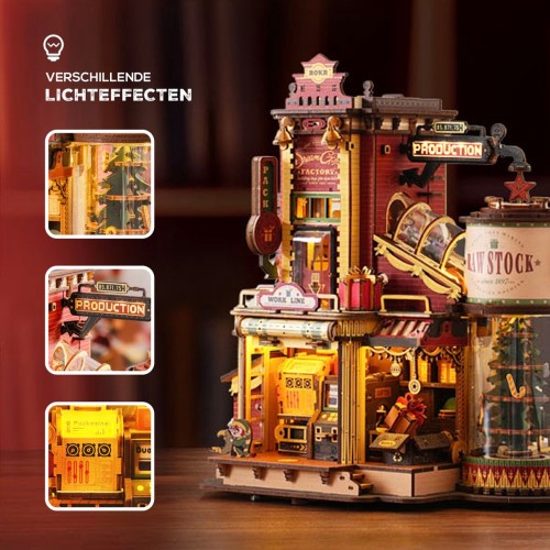Wie had ooit kunnen bedenken of het je zou lukken om eens een kijkje achter de schermen van de cadeautjes fabriek van de Kerstman te kijken. Hier worden alle Kerstcadeautjes gemaakt. Op de achtergrond speelt een muziekje en mochten Mrs. Claus en de elfjes even willen uitrusten kan dat bij de vintage lichtgevende openhaard. Er is een cadeautafel en een roterende inpakruimte. Wanneer de cadeautjes zijn ingepakt worden ze op de cadeau-uitgifteband gelegd en door de Kerstman bij de lieve kindertjes gebracht. Dit geweldige DIY-huisje is een mooie uitdaging om tijdens de Kerstdagen te maken, je zal zeker worden uitgedaagd door de 449 stukjes en een moeilijkheidsgraad van 6 sterren. Alle benodigde spullen zitten in de verpakking inclusief een stap-voor-stap handleiding met afbeeldingen om deze fabriek te maken.